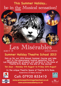 An extra curricular Drama School and Youth Theatre for ages 4 - 21. Classes in Acting, Singing and Dance and Musical Theatre. Annual Showcase. Senior Devised Theatre Productions. Physical Theatre. Masks and Mime. Summer Holiday Course - a full musical in just ten days. 2013 Summer Course - Les Misérables (School Edition) 5th - 16th August at Trestle Arts Base, St Albans, AL4 0JQ with 3 performances